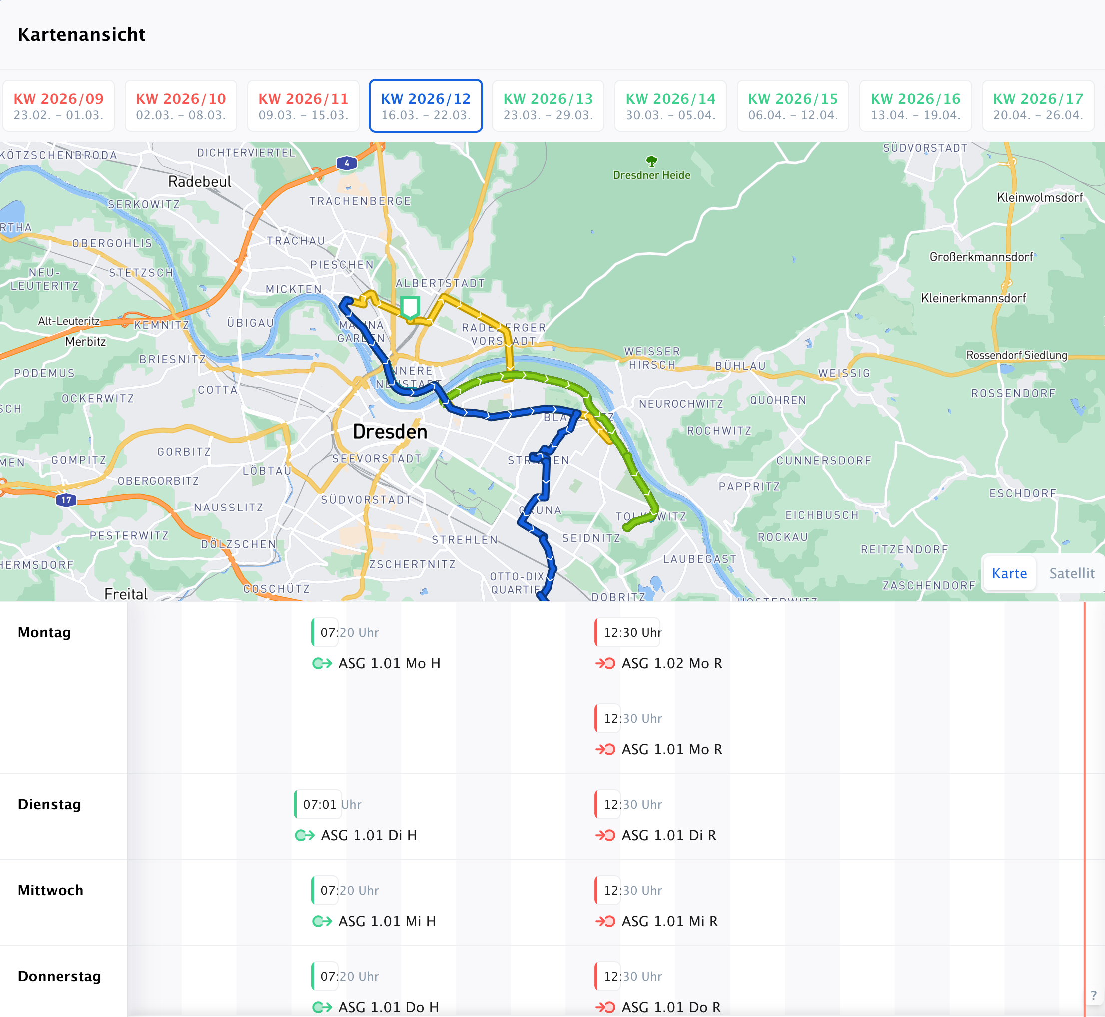 Ganz oben finden Sie wieder eine Kalenderwochen-Auswahl, um die verschiedenen Versionen der Touren vergleichen zu können. Unten finden Sie einen Zeitstrahl, der die Touren pro Wochentag darstellt, wodurch bspw. zeitliche Überschneidungen sichtbar werden.