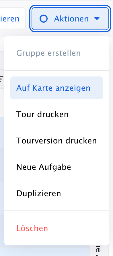 In der Tourenübersicht können die gewünschten Touren ausgewählt werden und mit “Aktionen” → “Auf Karte darstellen” in die neue Funktion übergeben werden.