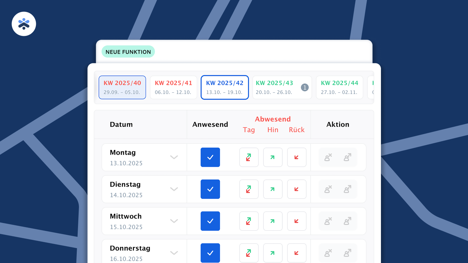 Sie können Abwesenheiten für den ganzen Tag oder nur die Hin- / Rückfahrt hinterlegen.