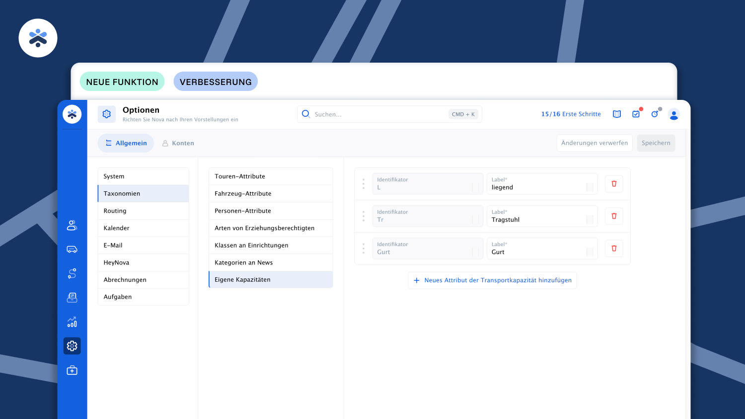 NovaHub Optionen: unter “Attribute” oder “Taxonomien” können Sie nun eigene Beförderungs-Kapazitäten hinzufügen.