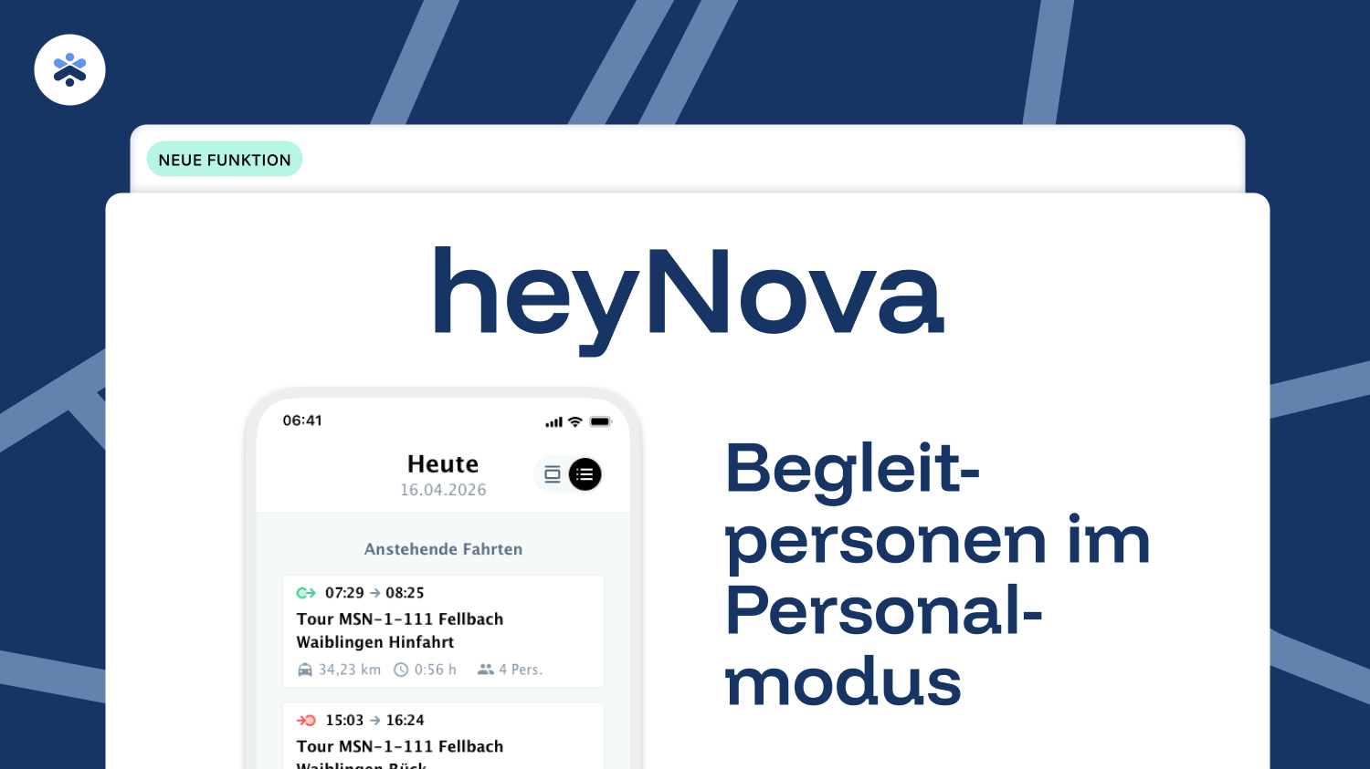 Die Zeiterfassung und Dienstplanübermittlung von Begleitpersonen war in heyNova bislang nur über den “Fahrzeugmodus” möglich. Begleitpersonen konnten sich nicht persönlich anmelden und an eigenen Geräten ihre Arbeitszeit erfassen. Das ist mit dem neuen Update jetzt möglich.