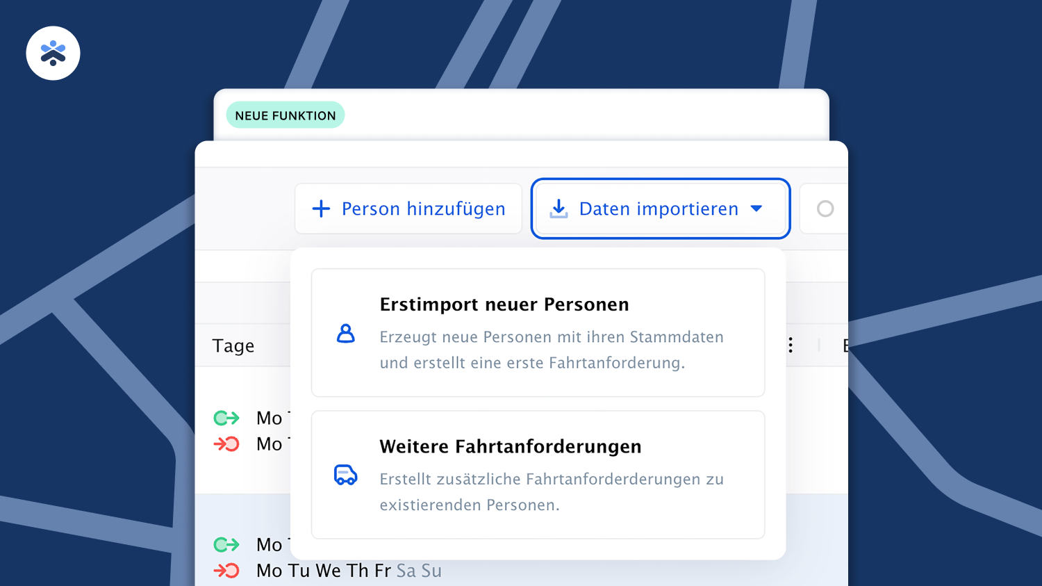 Wir haben eine neue Importvorlage für Fahrtanforderungen hinzugefügt. Sie können darüber nun Fahrtanforderungen für einzelne Personen hinzufügen, die Sie bereits in NovaHub angelegt haben, oder bestehende Fahrtanforderungen duplizieren und mit Anpassungen wieder hochladen. Den Wikiartikel dazu finden Sie hier: Weitere Fahrtanforderungen importieren